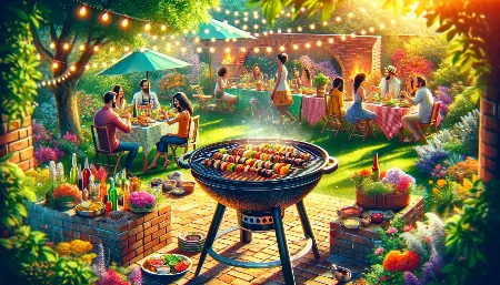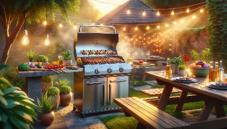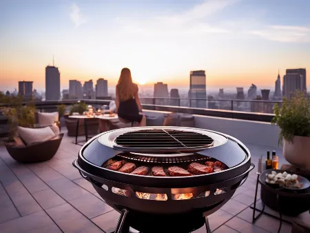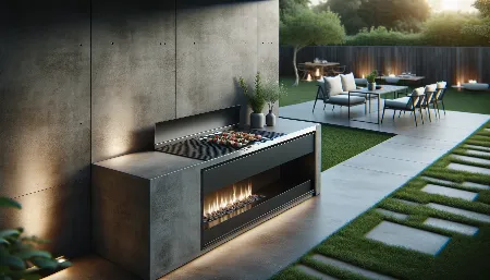 Наружный патио в сумерках с круглым каменным кострищем