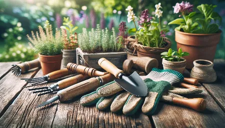 Промт для генерации изображений в нейросетях на тему: "Садовый инвентарь и техника"