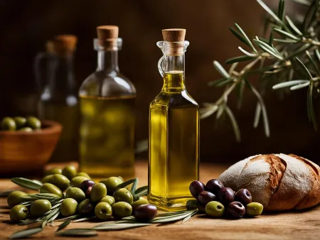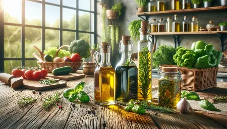 Широкоугольное изображение ассортимента натуральных масел и жиров, изящно расположенных на деревянном столе
