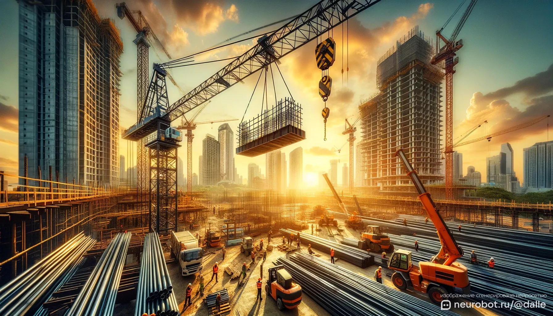 Широкоугольный снимок оживленной стройплощадки на закате