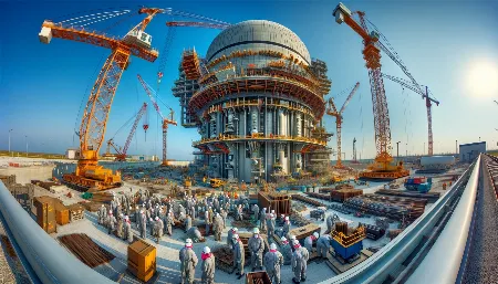 Промт для генерации изображений в нейросетях на тему: "Строительство, обслуживание АЭС, ГЭС, ТЭЦ"