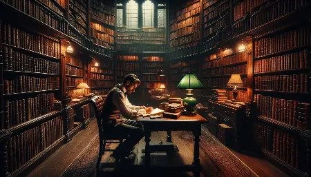 Спокойная библиотечная обстановка с солнечными лучами, проникающими сквозь большие окна