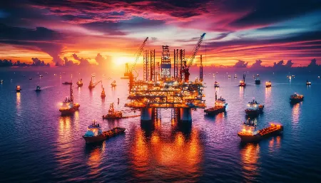 Промт для генерации изображений в нейросетях на тему: "Строительство нефтегазовых объектов"